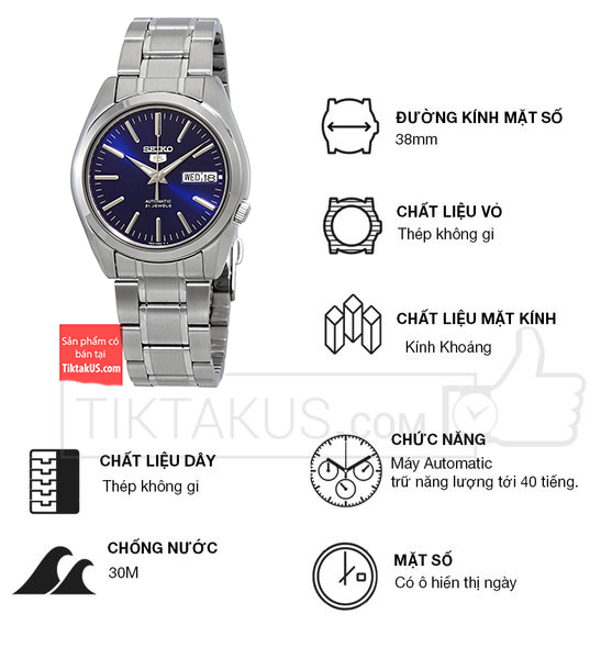 • Seiko 5 automatic SNKL43K1 có kích thước size mặt 38mm phù hợp với các chàng trai có cổ tay vừa và nhỏ. Chất liệu mặt kính Harlex, bền bỉ , chống trầy tương đối tốt và khả năng chống va đập tốt.