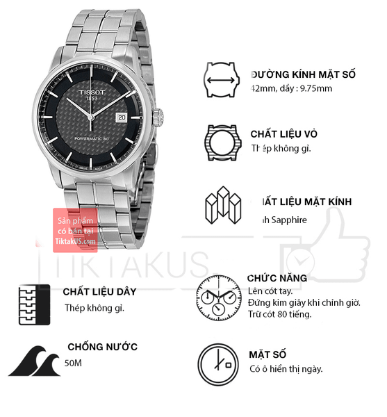 - TISSOT là một trong những hãng đồng hồ nổi tiếng nhất Thế giới. Với bề dầy lịch sử hàng trăm năm , Tissot đã tạo ra những sản phẩm sang trọng và tinh tế nhưng vẫn bển bỉ và luôn chính xác. Dòng máy Powermatic 80 của Tissot chính là đỉnh cao trong nghệ thuật chế tạo đồng hồ của hãng với mức trữ cót lên tới 80 tiếng liên tục. Mẫu đồng hồ Tissot T086.407.11.201.02 sử dụng máy Powermatic 80 mang lại độ ổn định tuyệt vời cho sản phẩm.