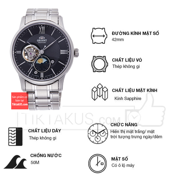 • Orient Sun and Moon có kích thước size mặt 42 mm phù hợp với các chàng trai có cổ tay vừa và to. Chất liệu mặt kính sapphire bền bỉ , chống trầy tốt và khả năng chống va đập tốt.