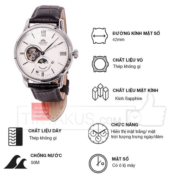 • Đồng hồ nam Orient Sun and Moon RA-AS0005S10B là một trong những mẫu đồng hồ kiểu dáng thời trang nổi bật của thương hiệu Orient đến từ Nhật Bản, sản phẩm này đã tạo nên tên tuổi của hãng Orient trên thị trường đồng hồ thời trang nam Automatic cao cấp.