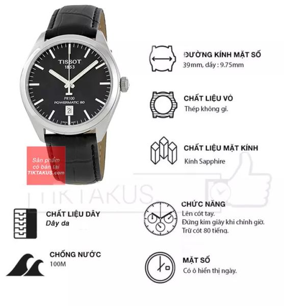 - TISSOT là một trong những hãng đồng hồ nổi tiếng nhất Thế giới. Với bề dầy lịch sử hàng trăm năm , Tissot đã tạo ra những sản phẩm sang trọng và tinh tế nhưng vẫn bển bỉ và luôn chính xác. Dòng máy Powermatic 80 của Tissot chính là đỉnh cao trong nghệ thuật chế tạo đồng hồ của hãng với mức trữ cót lên tới 80 tiếng liên tục. Mẫu đồng hồ Tissot T101.407.16.051.00 sử dụng máy Powermatic 80.