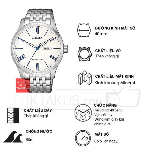 • Đồng hồ nam Citizen automatic NH8350-59B có kích thước size mặt 40mm phù hợp với các chàng trai có cổ tay trung bình và lớn. Chất liệu mặt kính khoáng Mineral, bền bỉ , chống trầy tương đối tốt và khả năng chống va đập tốt.