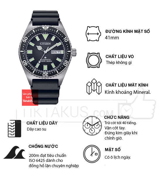 • Đồng hồ nam Citizen Promaster automatic NY0120-01E có kích thước size mặt 41mm phù hợp với các chàng trai có cổ tay trung bình và lớn. Chất liệu mặt kính khoáng Mineral, bền bỉ , chống trầy tương đối tốt .