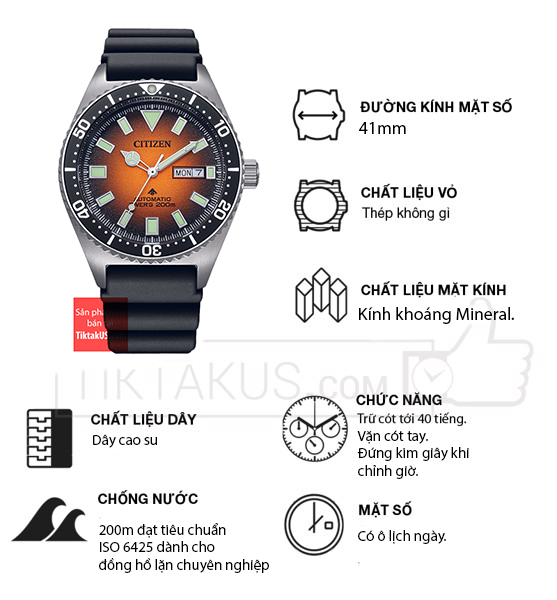 • Đồng hồ nam Citizen Promaster automatic NY0120-01Z có kích thước size mặt 41mm phù hợp với các chàng trai có cổ tay trung bình và lớn. Chất liệu mặt kính khoáng Mineral, bền bỉ , chống trầy tương đối tốt .