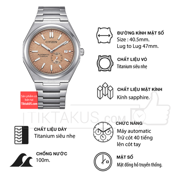 • Đồng hồ nam Citizen automatic NJ0180-80Z có kích thước size mặt 40mm phù hợp với các chàng trai có cổ tay trung bình và lớn. Chất liệu mặt kính Sapphire, bền bỉ , chống trầy tốt .