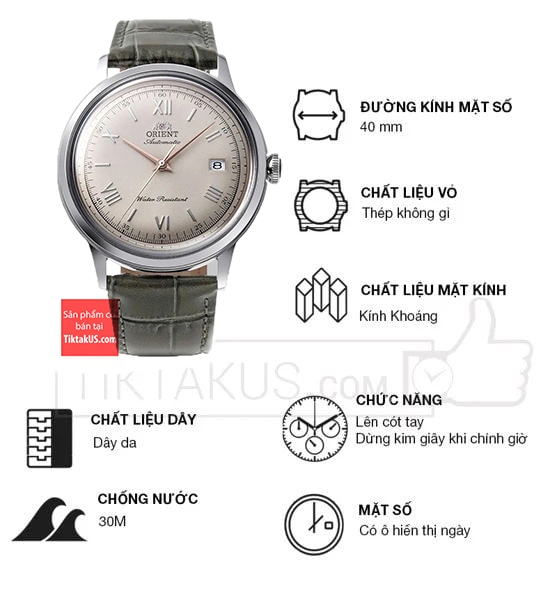 • Orient Bambino có kích thước size mặt 40.5 mm phù hợp với các chàng trai có cổ tay vừa và to. Chất liệu mặt kính sapphire bền bỉ , chống trầy tốt và khả năng chống va đập tốt.