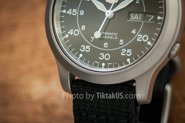 - Seiko SNK809 thuộc dòng sản phẩm mang phong cách quân đội của Seiko. Thiết kế của Seiko SNK809 không quá cầu kỳ với phần vỏ bằng thép không gỉ được gia công xử lý bề mặt dạng nhám mờ, mặt số chỉ gồm những chữ số latin, hiển thị giờ rõ ràng và chính xác tuyệt đối. Bộ dây làm từ vải Canvas giúp bạn có thể đeo chiếc đồng hồ này trên tay cả ngày mà không cảm thấy khó chịu.
