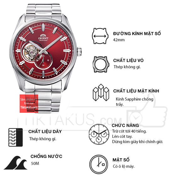 • Orient Contemporary có kích thước size mặt 42 mm phù hợp với các chàng trai có cổ tay vừa và to. Chất liệu mặt kính Sapphire, bền bỉ , chống trầy và khả năng chống va đập tốt.