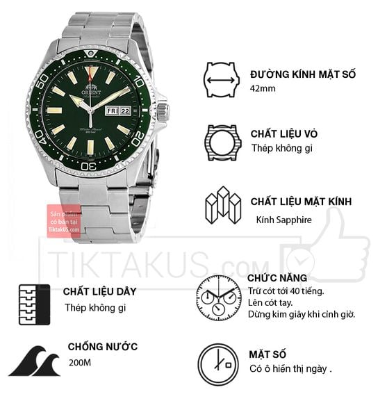 • Orient Mako có kích thước size mặt 42mm phù hợp với các chàng trai có cổ tay vừa. Chất liệu mặt kính Sapphire, bền bỉ , chống trầy và khả năng chống va đập tốt.