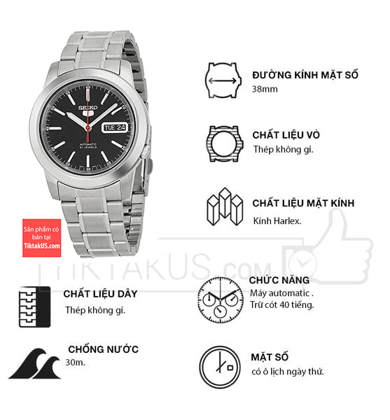 • Seiko 5 automatic SNKE53K1 có kích thước size mặt 38mm phù hợp với các chàng trai có cổ tay vừa và nhỏ. Chất liệu mặt kính Harlex, bền bỉ , chống trầy tương đối tốt và khả năng chống va đập tốt.