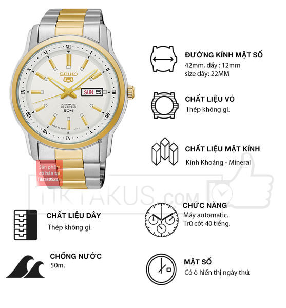 Seiko SNKP141J1 sử dụng máu Automatic mã 7s26 của Seiko với sai số thấp và khả năng trữ cót lên tới 40 tiếng. Kích thước mặt số là 42mm, thiết kế mang chất thể thao nhưng vẫn sang trọng.