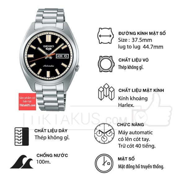 • Seiko 5 automatic SRPK89K1 có kích thước size mặt 37 mm phù hợp với các chàng trai có cổ tay vừa và nhỏ. Chất liệu mặt kính Harlex, bền bỉ , chống trầy tương đối tốt và khả năng chống va đập tốt.