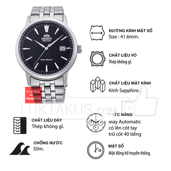 • Orient Contemporary có kích thước size mặt 41.6mm phù hợp với các chàng trai có cổ tay vừa và to. Chất liệu mặt kính Sapphire, bền bỉ , chống trầy và khả năng chống va đập tốt.
