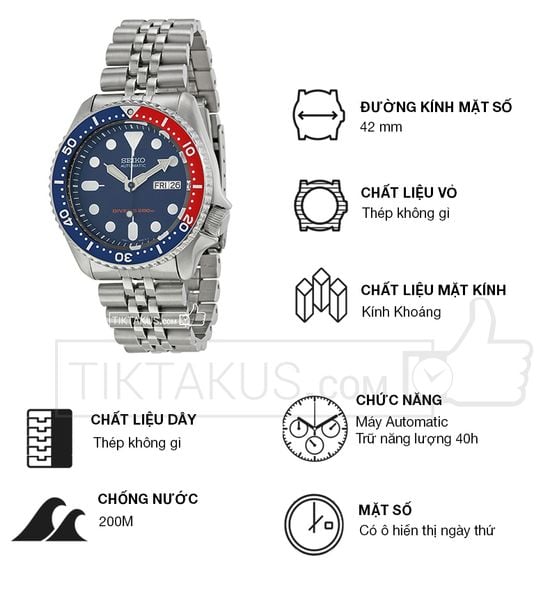- Seiko SKX009 là một chiếc đồng hồ mang đậm chất thể thao với tiêu chuẩn chống nước chuẩn Diver 200m. Với thiết kế toàn thân bằng thép không gỉ và bộ vỏ góc cạnh mạnh mẽ, viền bezel xoay đúng chất Diver, đây là một chiếc đồng hồ bạn sẽ thích ngay khi cầm trên tay nếu bạn là một fan của dòng đồng hồ thể thao