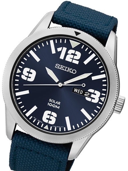Đồng hồ nam Seiko SNE329 mặt số cổ điển hiển thị rõ giờ, phút, ngày cùng màu xanh tráng men đẹp tuyệt vời.
