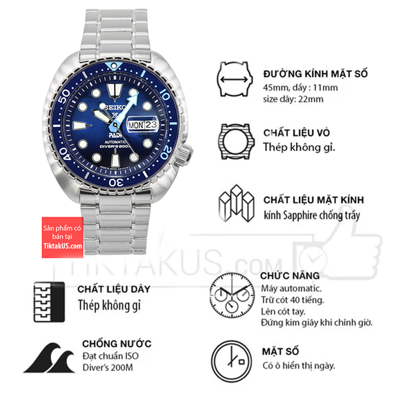 • Đồng hồ nam SEIKO Prospex King Turtle SRPK01J1 là một trong những mẫu đồng hồ thuộc dòng đồng hồ thể thao nam automatic cao cấp của thương hiệu Seiko đến từ Nhật Bản, đồng hồ Seiko Prospex Automatic đã tạo nên tên tuổi của hãng Seiko trên thị trường đồng hồ thể thao nam Automatic cao cấp.