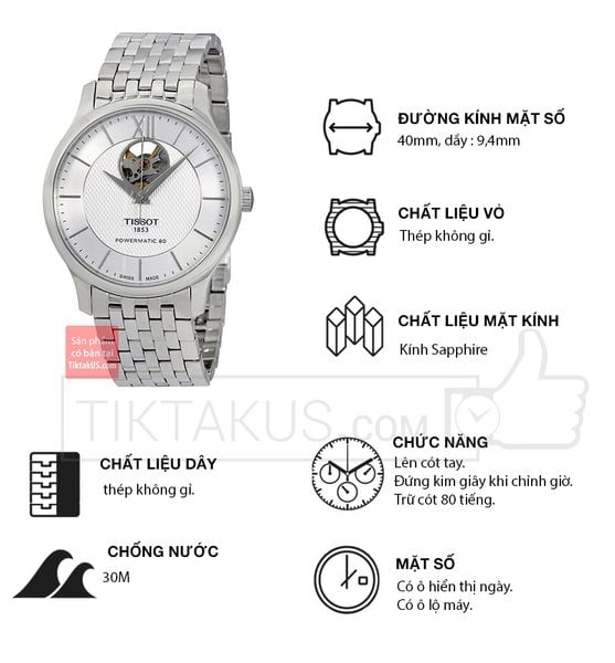 TISSOT là một trong những hãng đồng hồ lâu đời của Thụy Sỹ. Với bề dầy lịch sử hàng trăm năm , Tissot đã tạo ra những sản phẩm tinh tế nhưng vẫn bển bỉ và luôn chính xác. Dòng máy Powermatic 80 của Tissot chính là tinh hoa trong nghệ thuật chế tạo đồng hồ của hãng với mức trữ cót lên tới 80 tiếng liên tục. Mẫu đồng hồ Tissot open heart T063.907.11.038.00 là dòng sản phẩm hướng đến những người yêu thích nét đẹp tinh tế nhưng vẫn hiện đại.