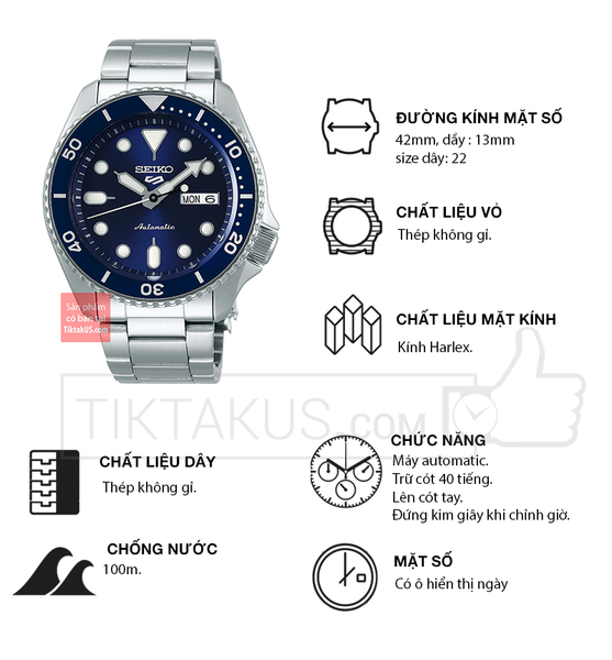 • Seiko 5 automatic SRPD51K1 có kích thước size mặt 42 mm phù hợp với các chàng trai có cổ tay vừa và nhỏ. Chất liệu mặt kính Harlex, bền bỉ , chống trầy tương đối tốt và khả năng chống va đập tốt.