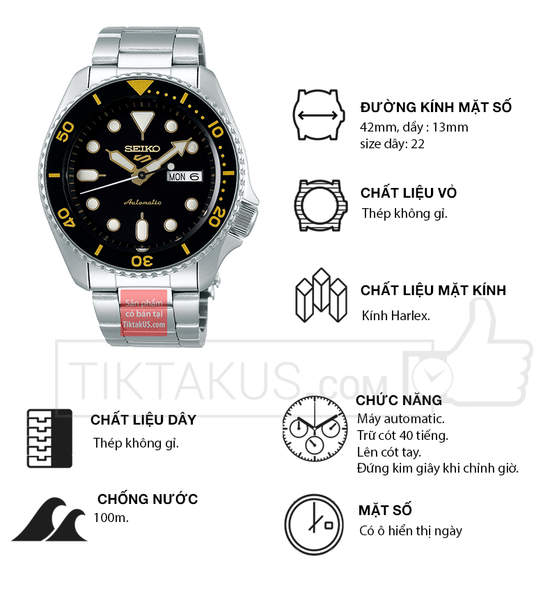 • Seiko 5 automatic SRPD57K1 có kích thước size mặt 42 mm phù hợp với các chàng trai có cổ tay vừa và nhỏ. Chất liệu mặt kính Harlex, bền bỉ , chống trầy tương đối tốt và khả năng chống va đập tốt.