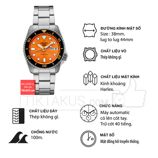 • Seiko 5 automatic SRPK35K1 có kích thước size mặt 38 mm phù hợp với các chàng trai có cổ tay vừa và nhỏ. Chất liệu mặt kính Harlex, bền bỉ , chống trầy tương đối tốt và khả năng chống va đập tốt.