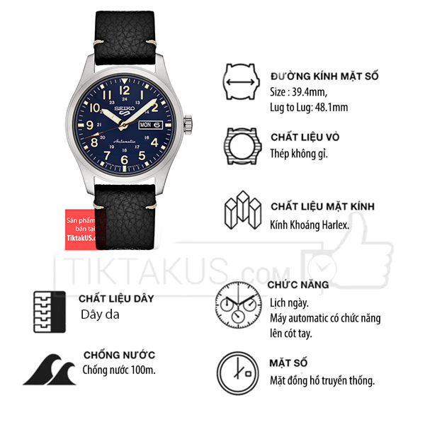 • Seiko 5 automatic SRPG39J1 có kích thước size mặt 39.5 mm phù hợp với các chàng trai có cổ tay vừa và nhỏ. Chất liệu mặt kính Harlex, bền bỉ , chống trầy tương đối tốt và khả năng chống va đập tốt.