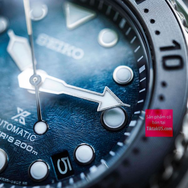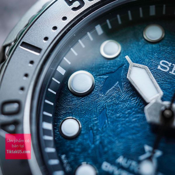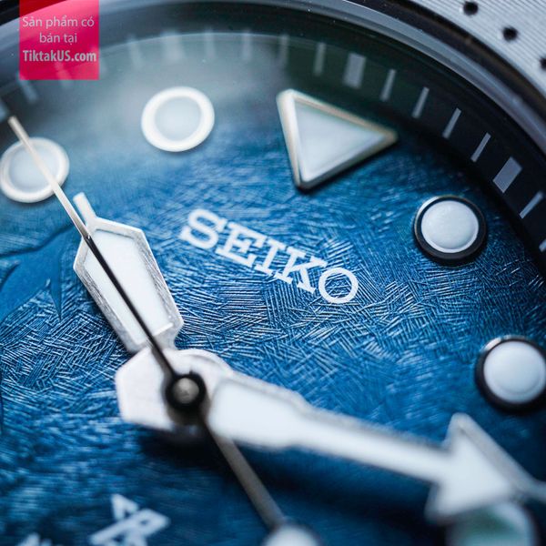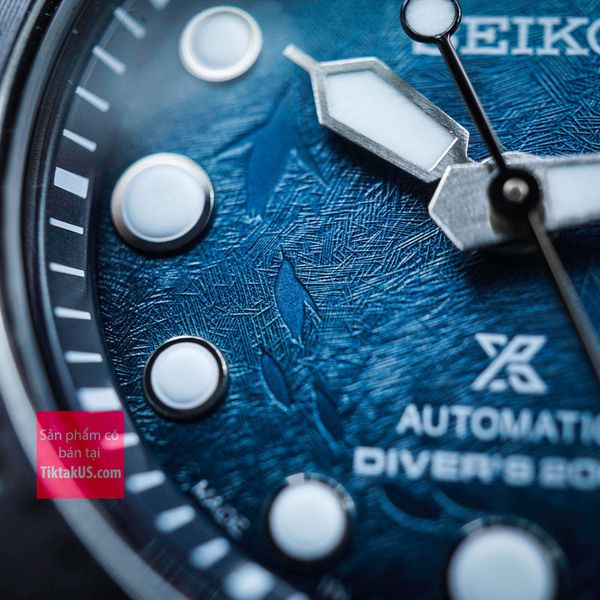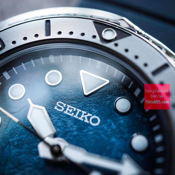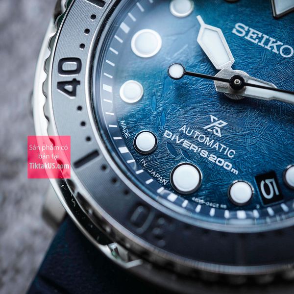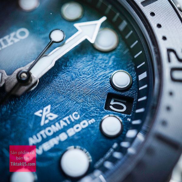 Seiko Prospex “Save The Ocean Antarctica” Baby Tuna SRPH77K1 tạo sự khác biệt với mặt số Dial được phối màu xanh nhạt mô phỏng bề mặt của các khối băng ở Bắc Cực và các dấu chân chim cánh cụt được khắc tinh tế lên một góc mặt số . Đây là cách Seiko truyền tải thông điệp về hiện tượng băng tan do nóng lên của trái đất.