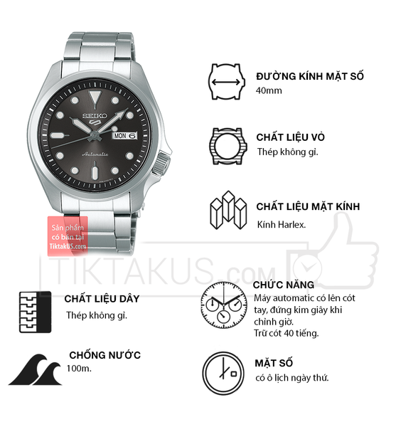 • Seiko 5 automatic SRPE51K1 có kích thước size mặt 40 mm phù hợp với các chàng trai có cổ tay vừa và nhỏ. Chất liệu mặt kính Harlex, bền bỉ , chống trầy tương đối tốt và khả năng chống va đập tốt.